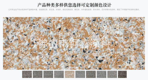 公司专业生产的水性涂料产品种类丰富,包括真石漆、仿石漆、水包砂、液态花岗岩漆、陶石彩、内外墙乳胶漆、防水涂料、艺术漆等水性涂料,满足了不同客户的多样化需求